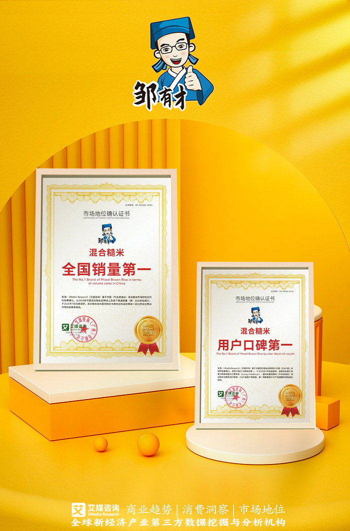 近期,邹有才获全球领先的新经济产业第三方数据挖掘和分析机构iiMedia Research(艾媒咨询)授予的“混合糙米全国销量第一”“混合糙米用户口碑第一”两项市场地位确认。