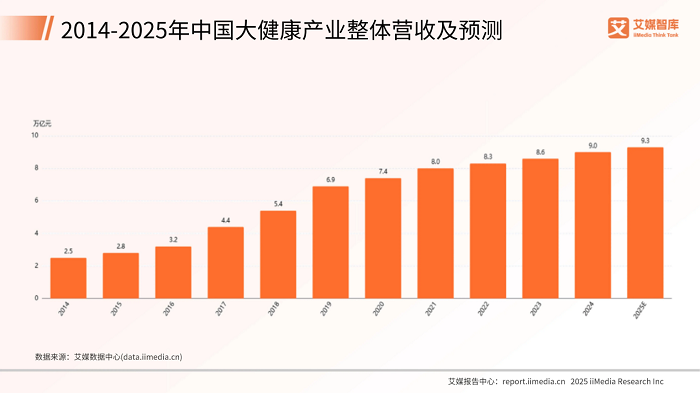在“健康中国”战略持续推进的宏观背景下,全民健康意识不断升级,健康饮食已成为大众生活的核心议题,这一趋势推动中国大健康产业稳健增长。iiMedia Research(艾媒咨询)数据显示,2024年中国大健康产业市场规模达9.0万亿元,2025年预计进一步增长至9.3万亿元。未来,在消费升级与产业创新驱动下,产业增长势能将持续释放,为健康饮食细分领域创造广阔空间。