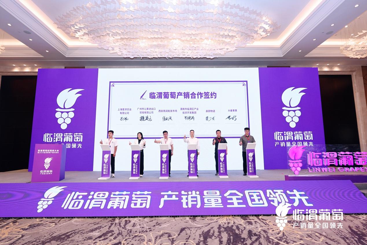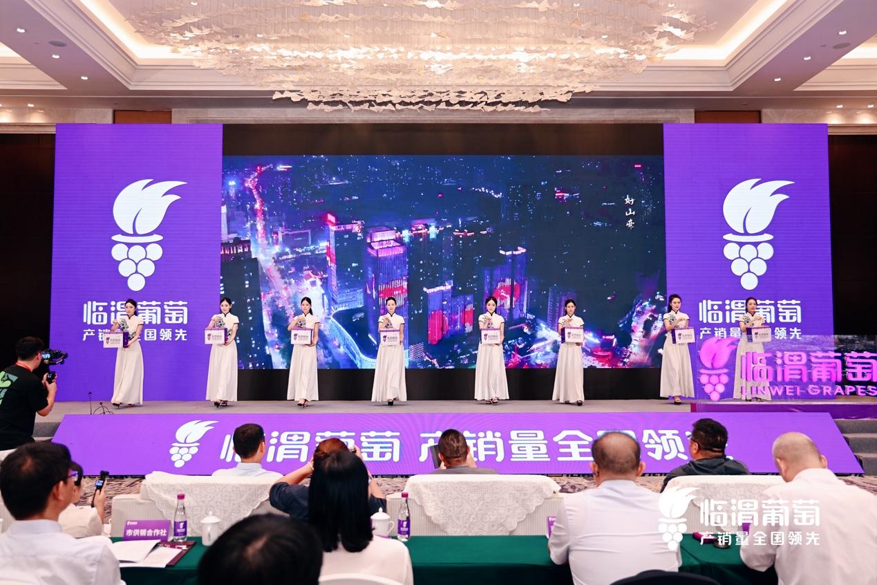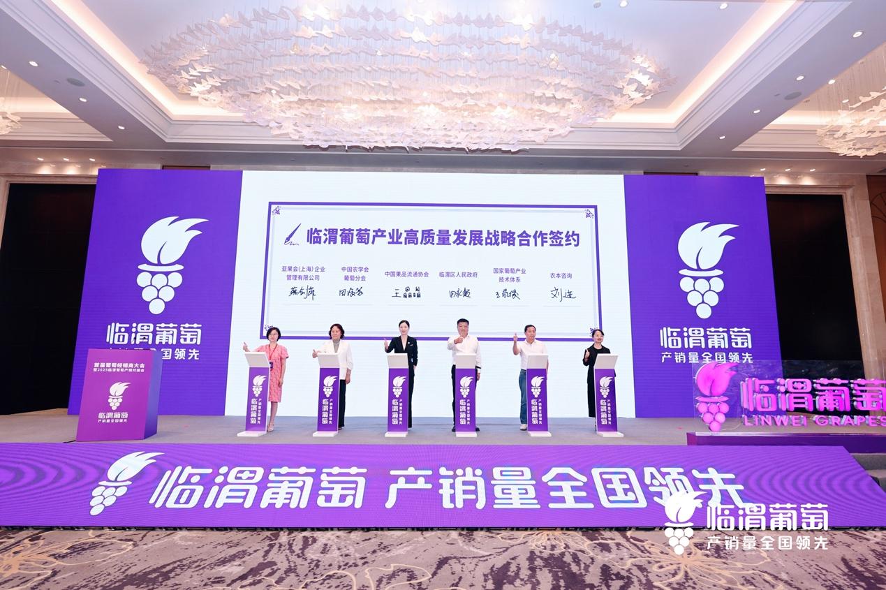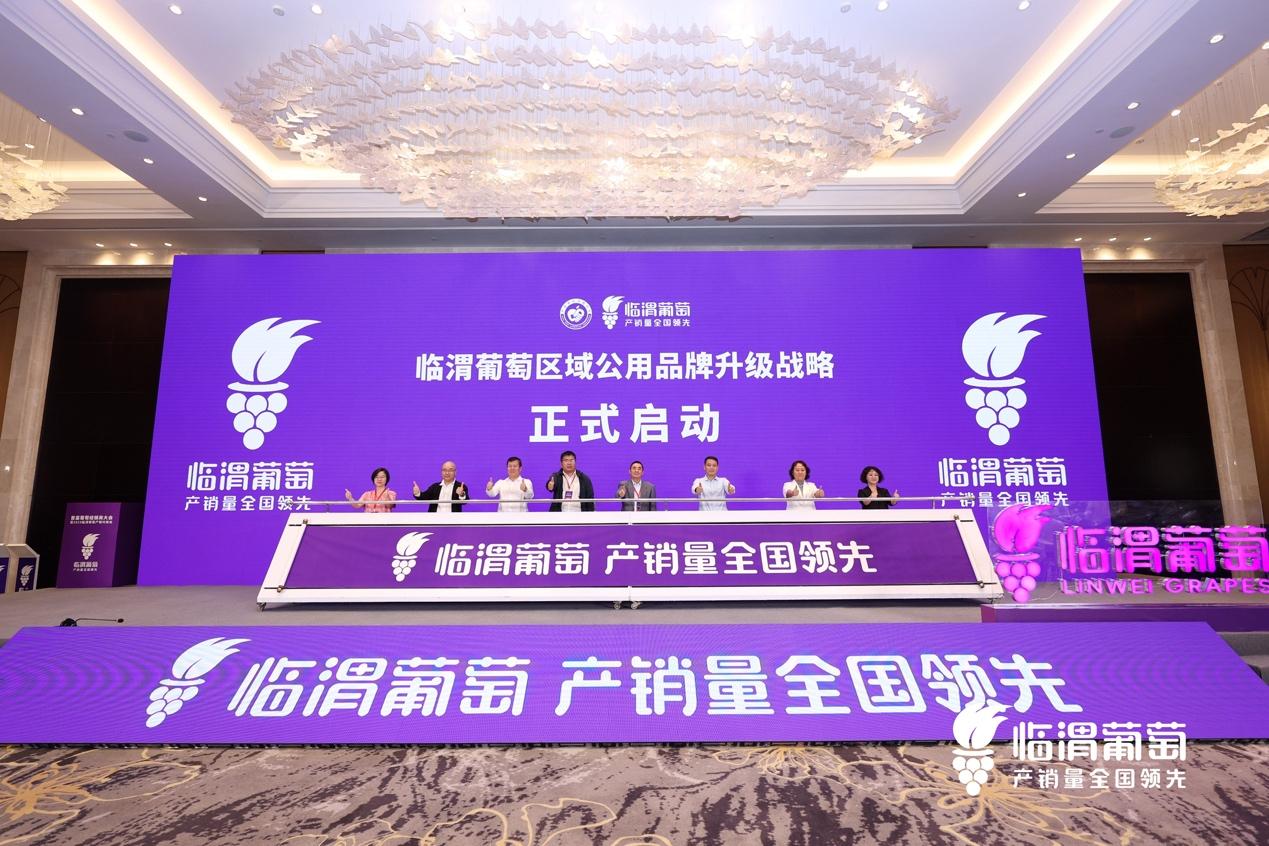 中国果品流通协会会长鲁芳校、陕西省果业中心主任赵广柱、国家葡萄产业技术体系首席科学家王海波、中国农学会葡萄分会会长田淑芬、渭南市临渭区区政府区长菊峰、渭南市市场监管局局长曾彩萍、农本咨询首席专家贾枭、亚果会创始人蔡剑菲共同启动了临渭葡萄品牌升级战略。