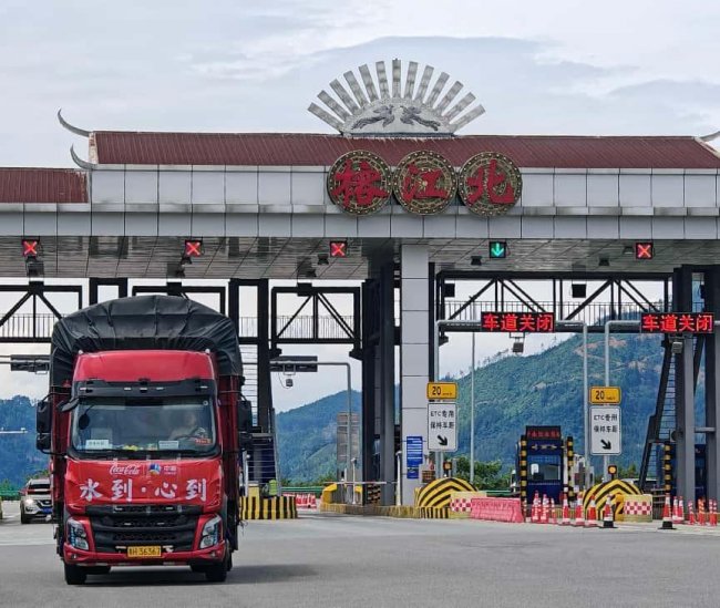 (图注:2025年6月24日,中粮可口可乐贵州厂启动“净水24小时”应急饮用水救援机制,支援榕江洪灾救援。图为中粮可口可乐救援物流车驶过榕江北收费站。)