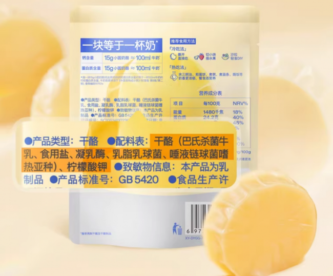 数据显示,每块15克独立包装的小圆奶酪,可满足1-3岁幼儿每日约24%的钙需求与14%的蛋白质需求。这意味着,家长无需额外搭配多种钙质补剂,通过在日常膳食中加入小圆奶酪的方式,即可高效完成关键营养的精准补充。